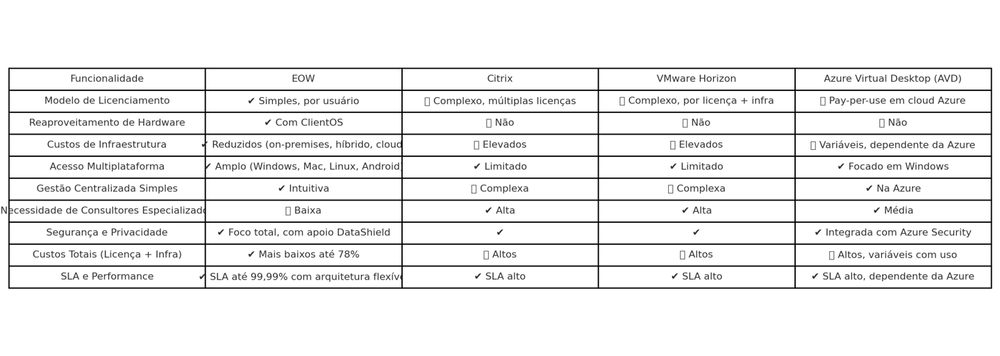 Implantação e operação facilitadas, sem a complexidade dos concorrentes como Citrix ou VMware Horizon.Modelo de Licenciamento Justo: